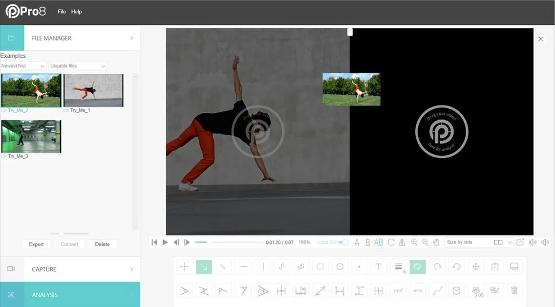 Simply drag and drop videos onto the screen to compare two videos at the same time to compare individuals with themselves or others.